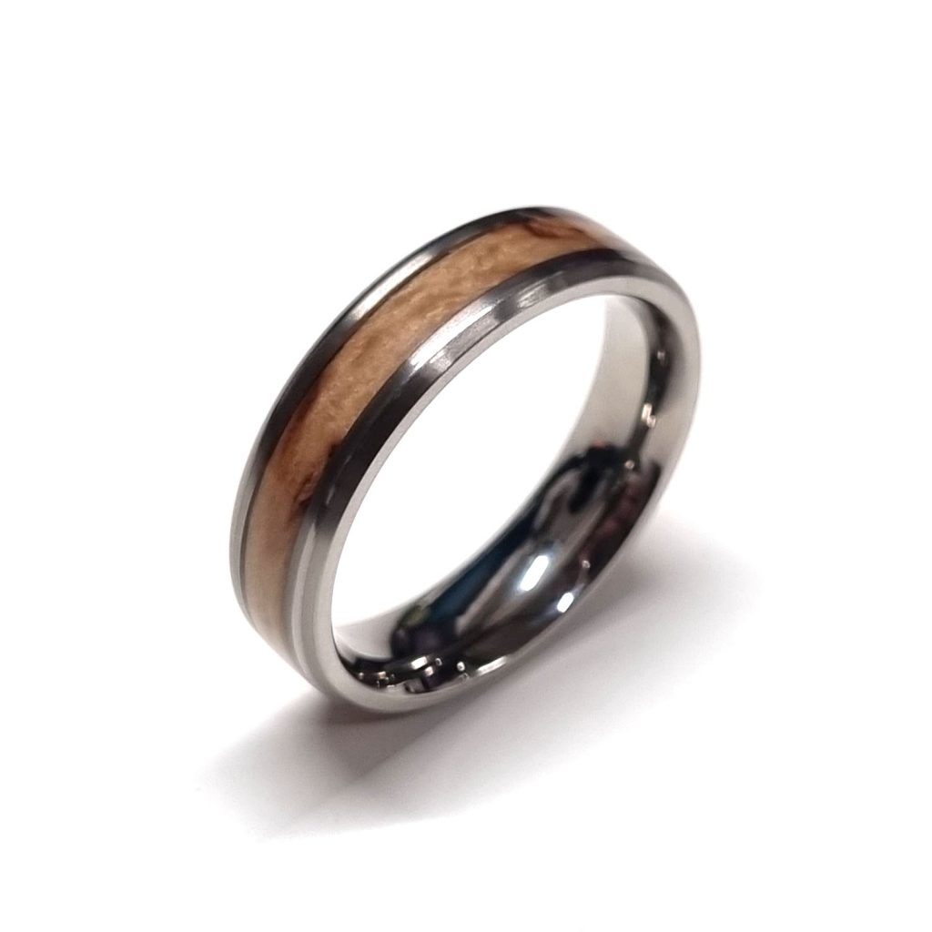 Puu ja metalli ovat näyttävä yhdistelmä. Metalli tuo sormukselle kestävyyttä ja käyttömukavuutta, kun taas puumateriaali on maanläheisempi elementti. Vaalea ja tumma puu toimivat molemmat erinomaisesti – valinta on sinun.